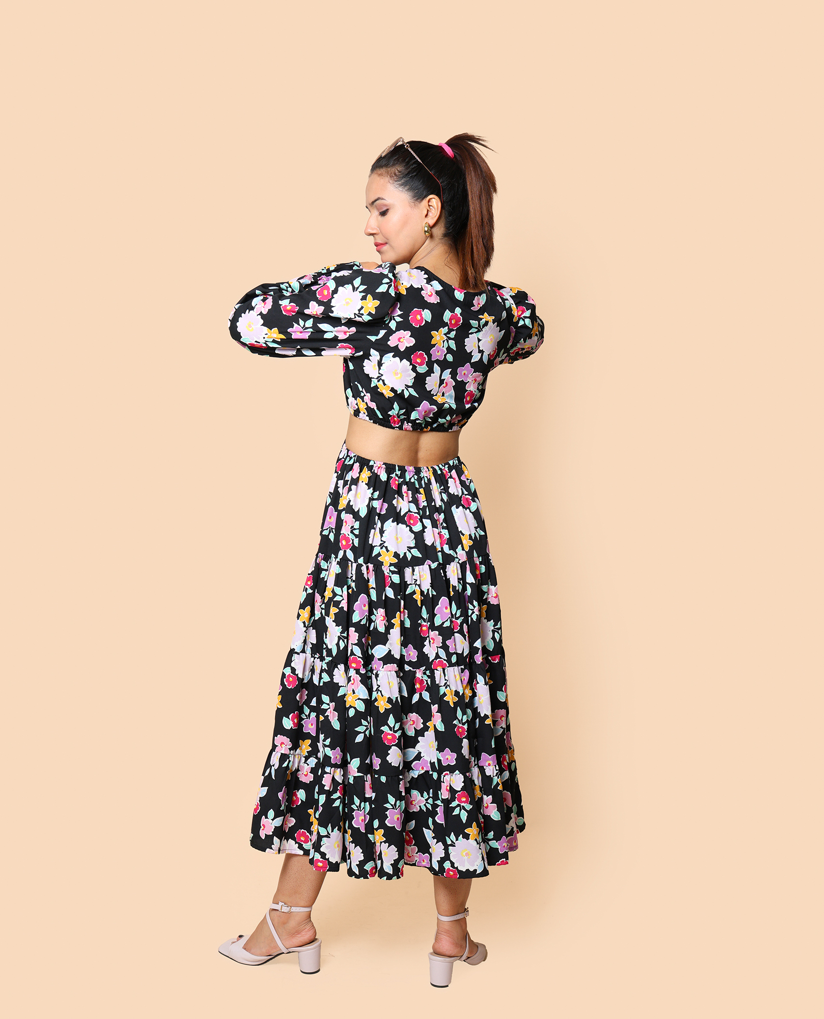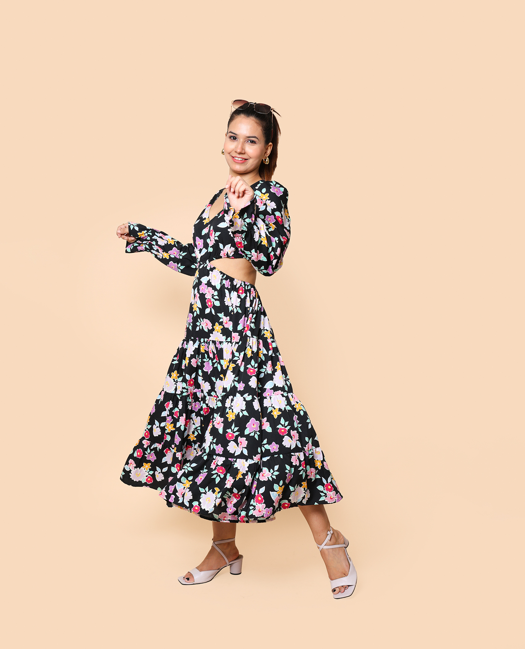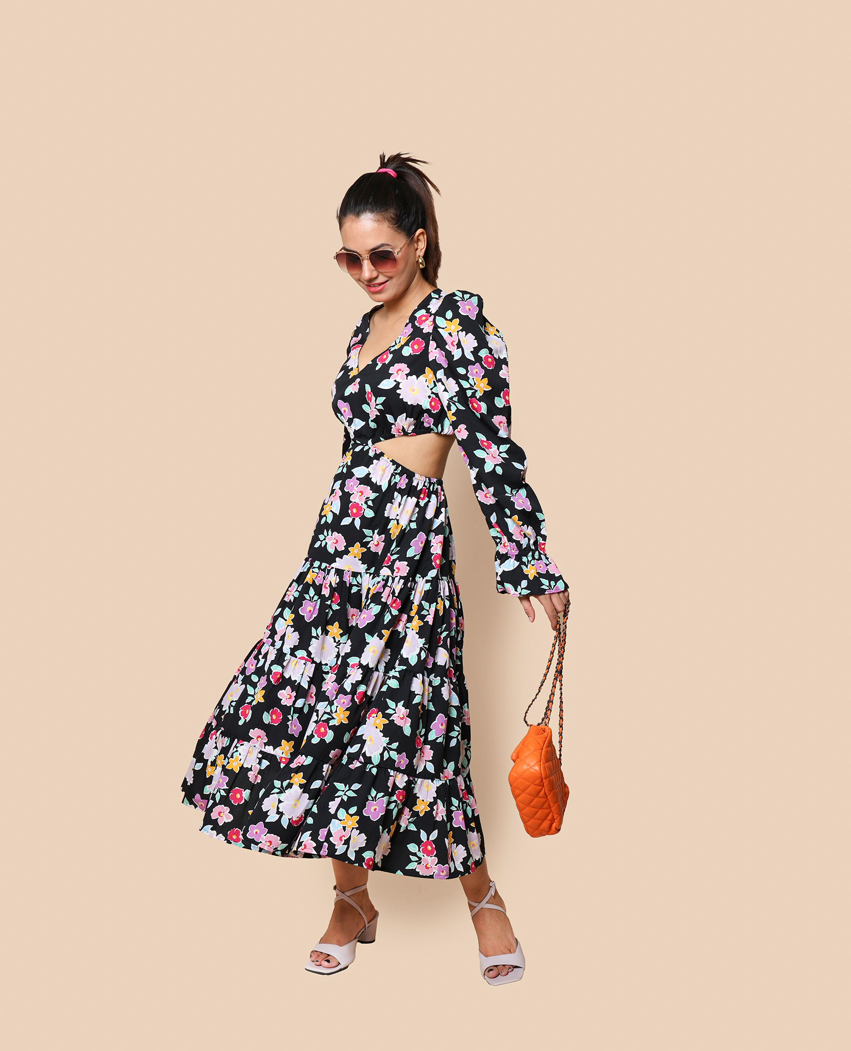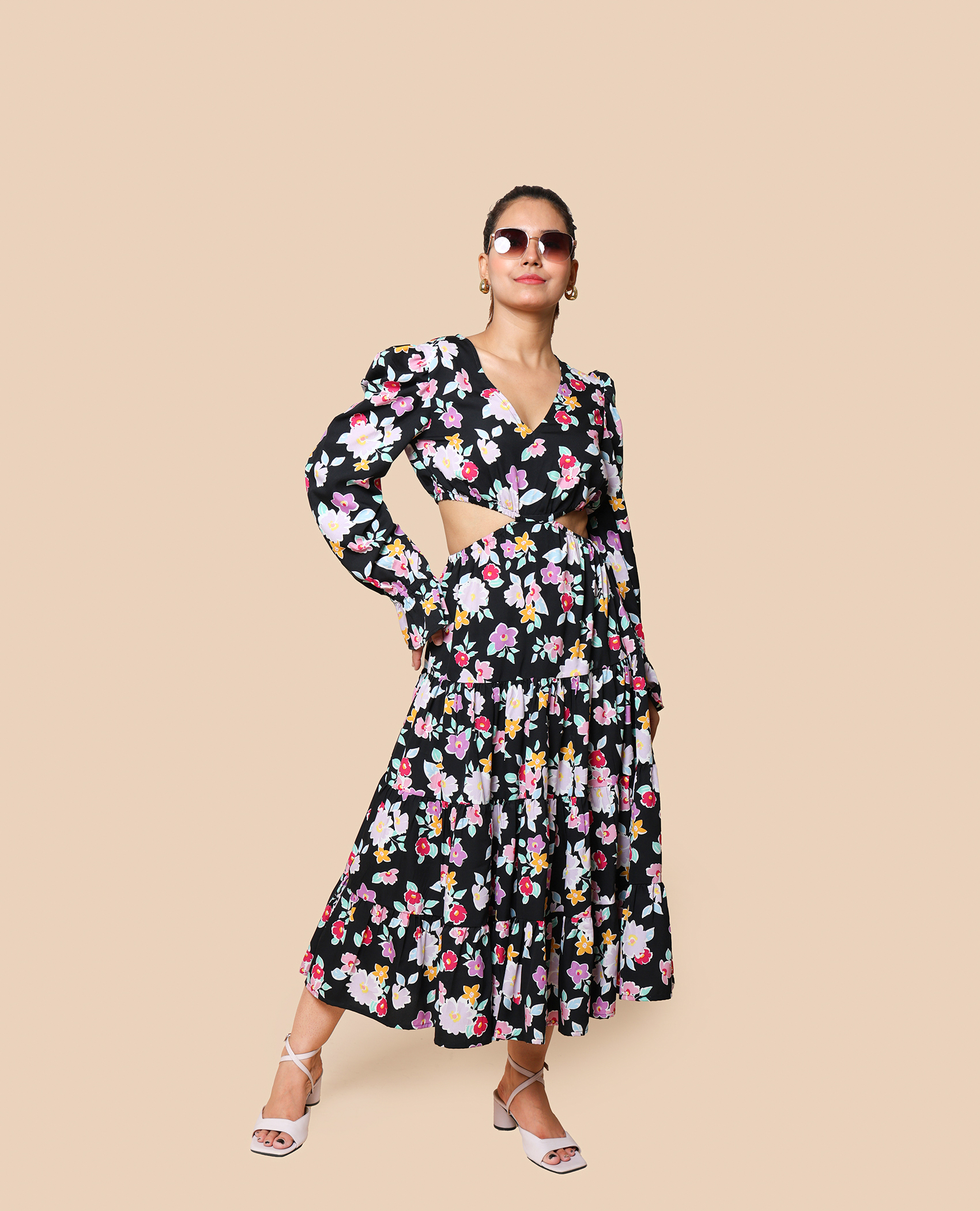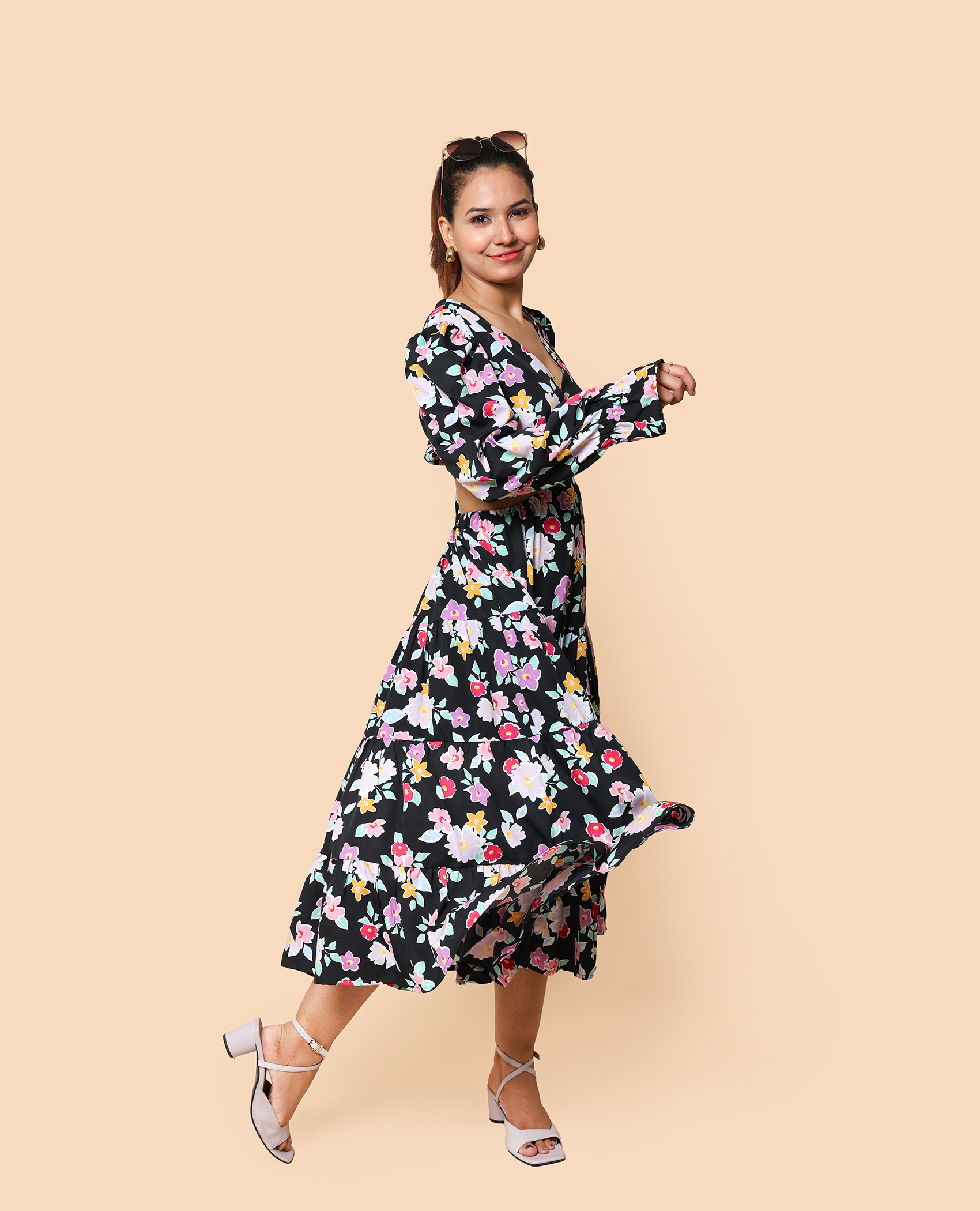 A comfy black floral dress made for casual outings. Soft fabric, relaxed fit, and floral prints that add a hint of freshness to your everyday style.