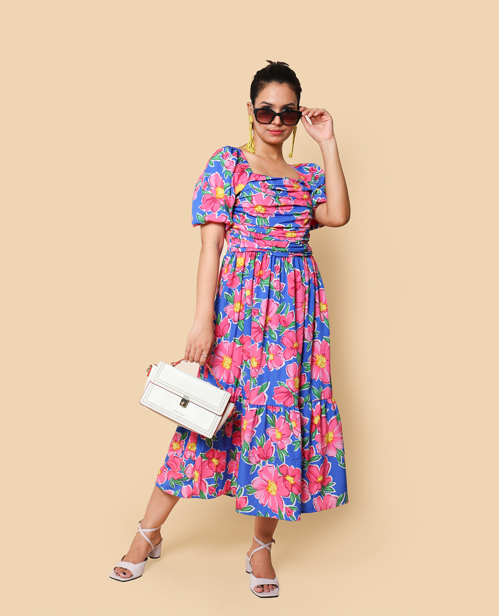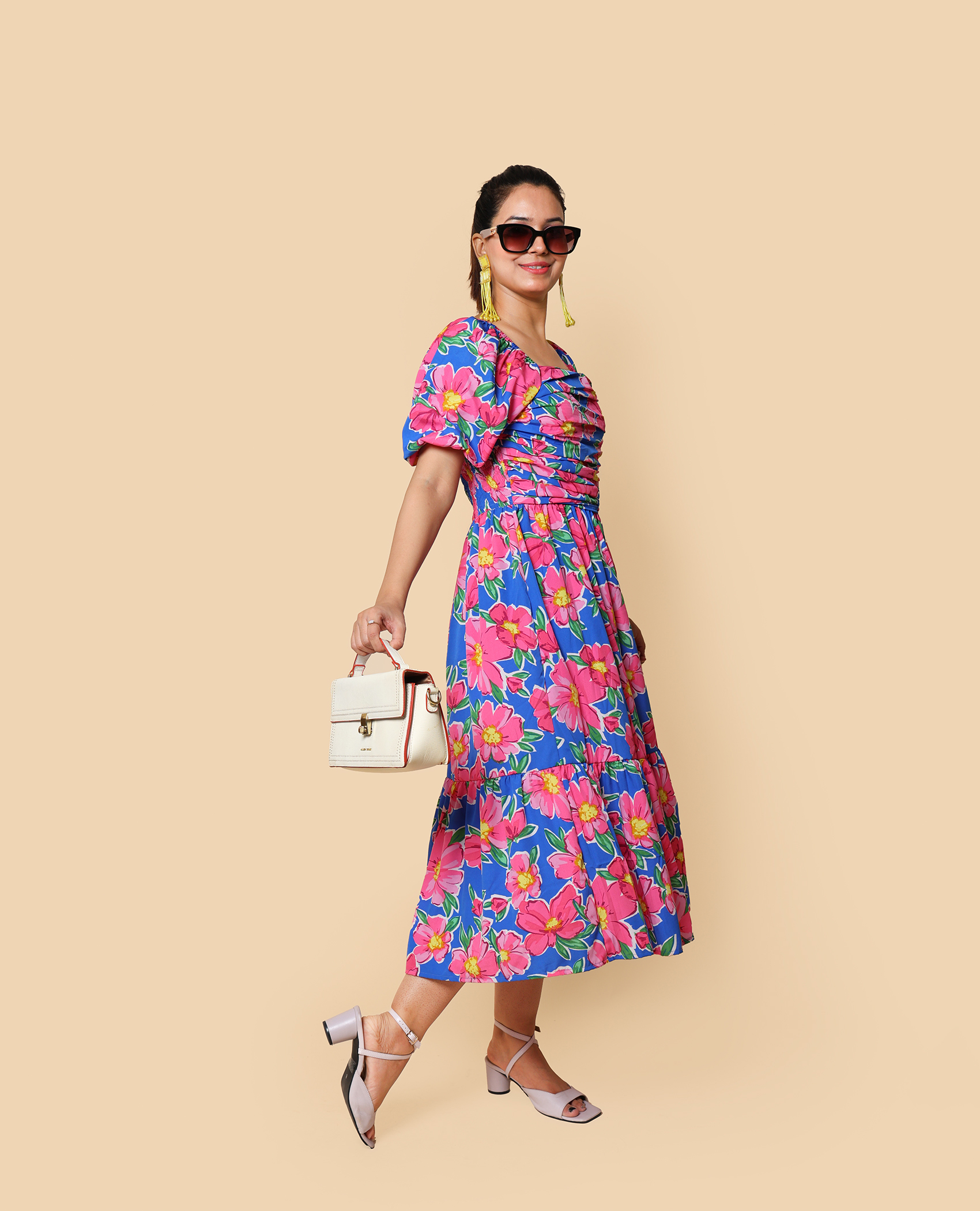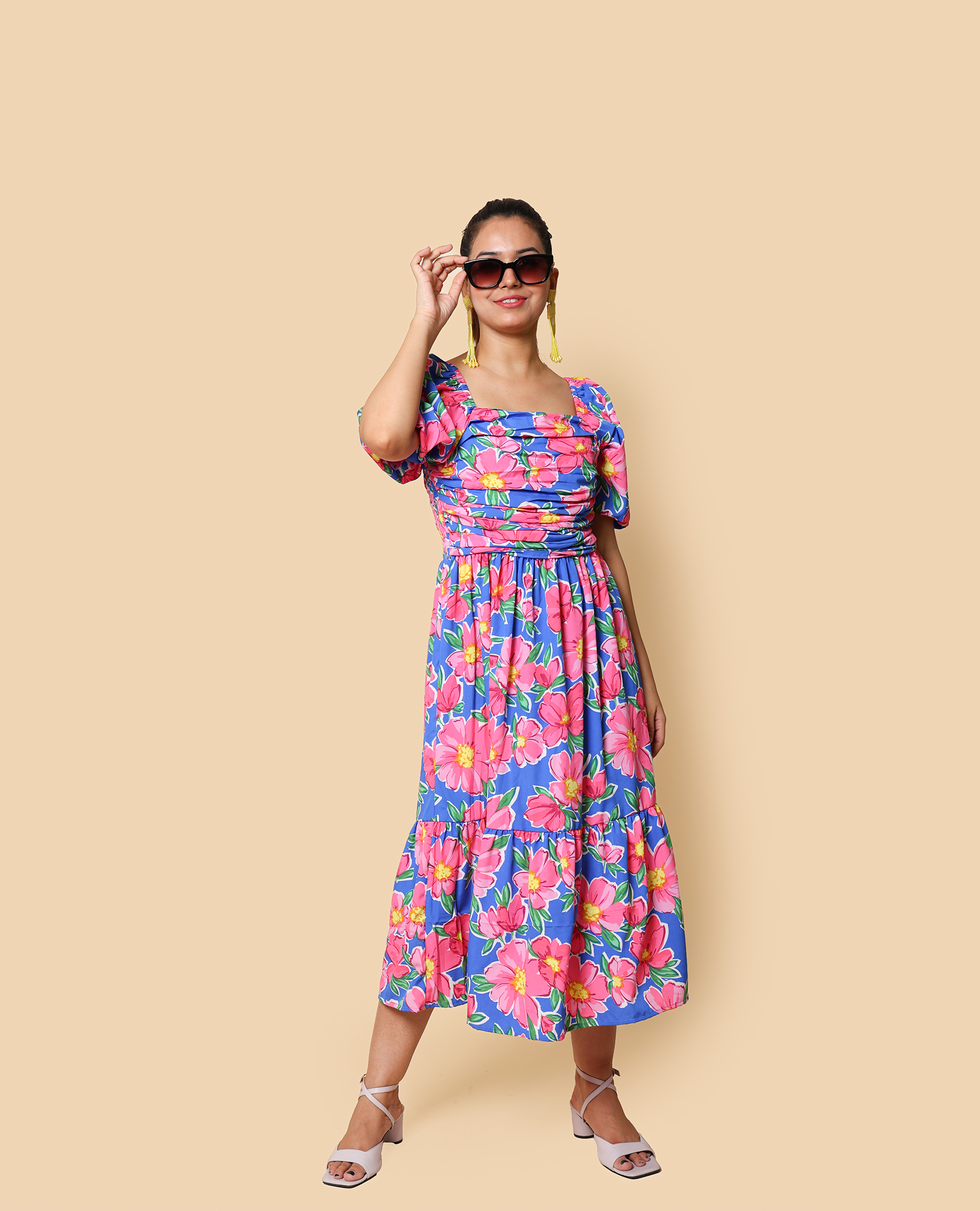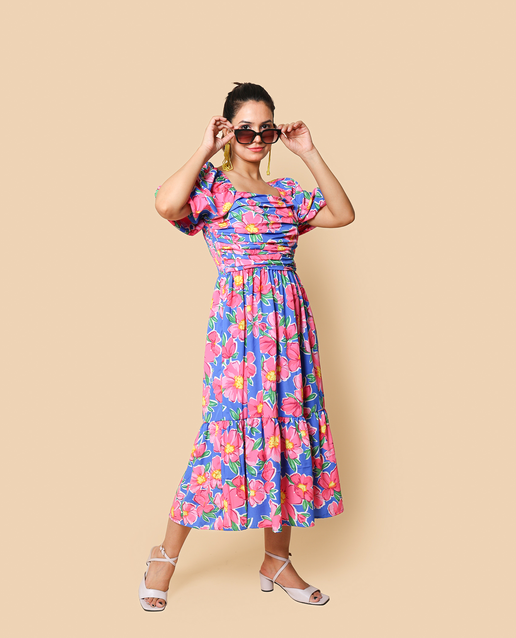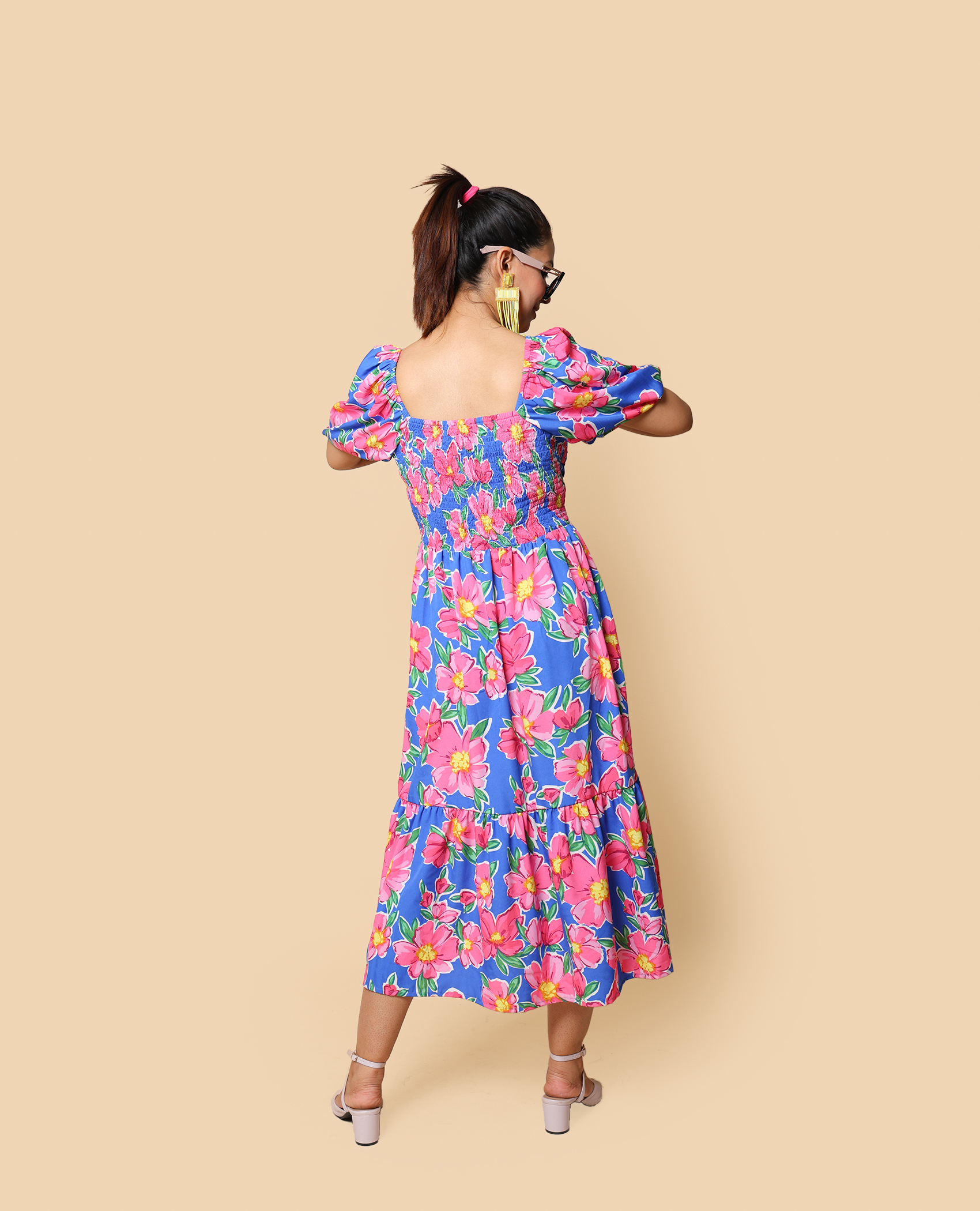 breezy royal blue floral dress with soft pink blooms — perfect for casual outings, café dates, or day strolls. Light, comfy, and effortlessly stylish.