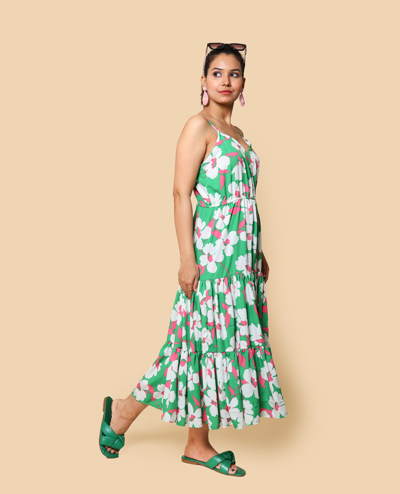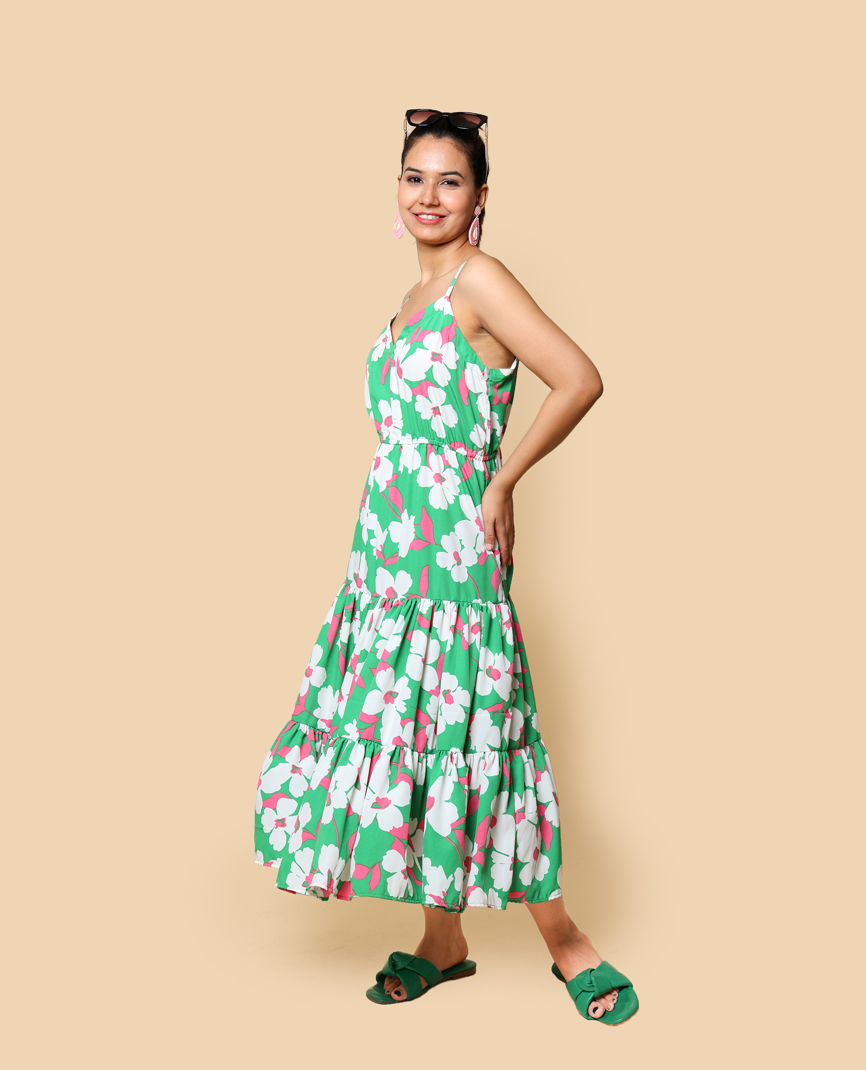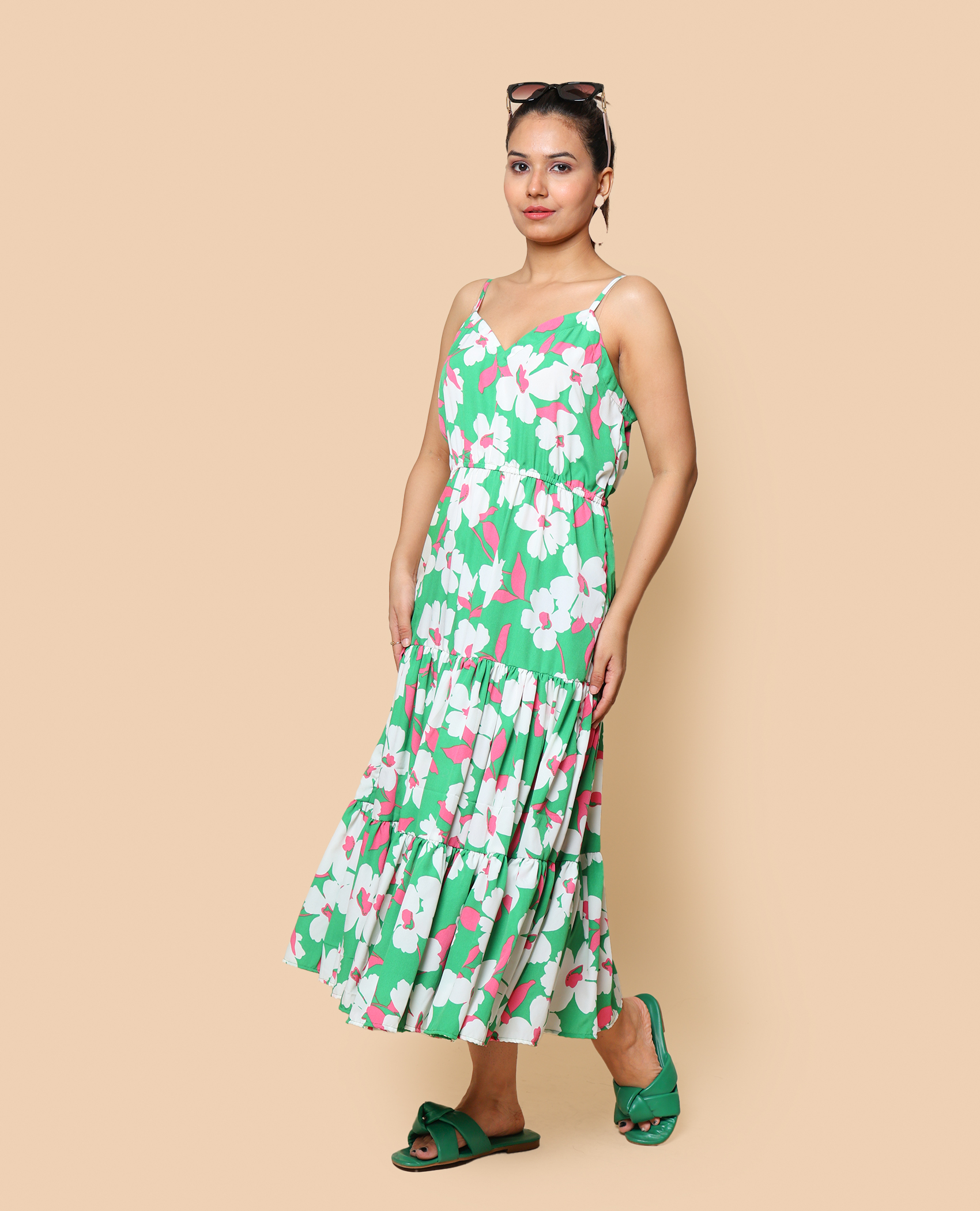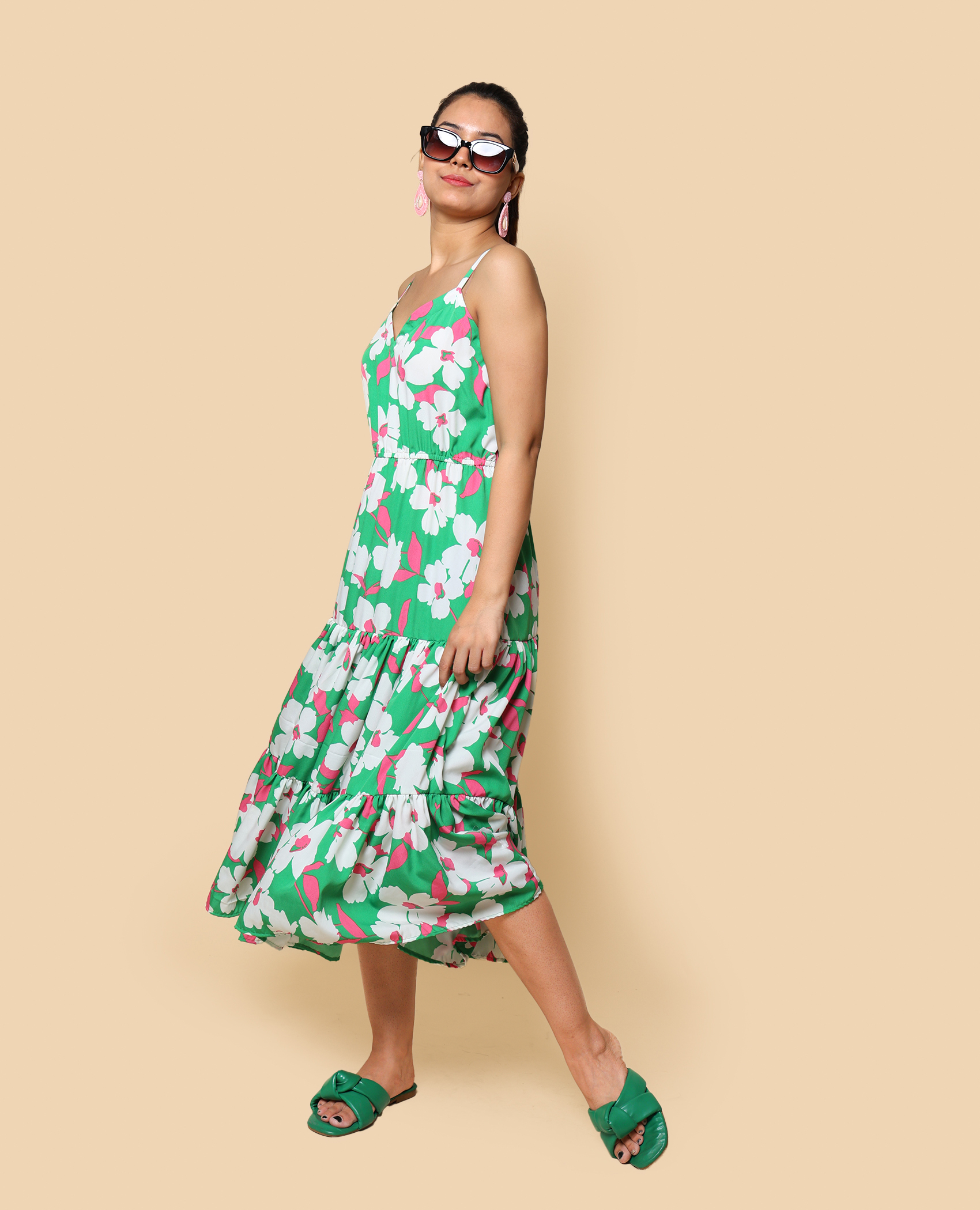 Inspired by lush greenery, this floral dress brings the freshness of nature to your vacation wardrobe. Flowing silhouette ensures comfort and elegance.