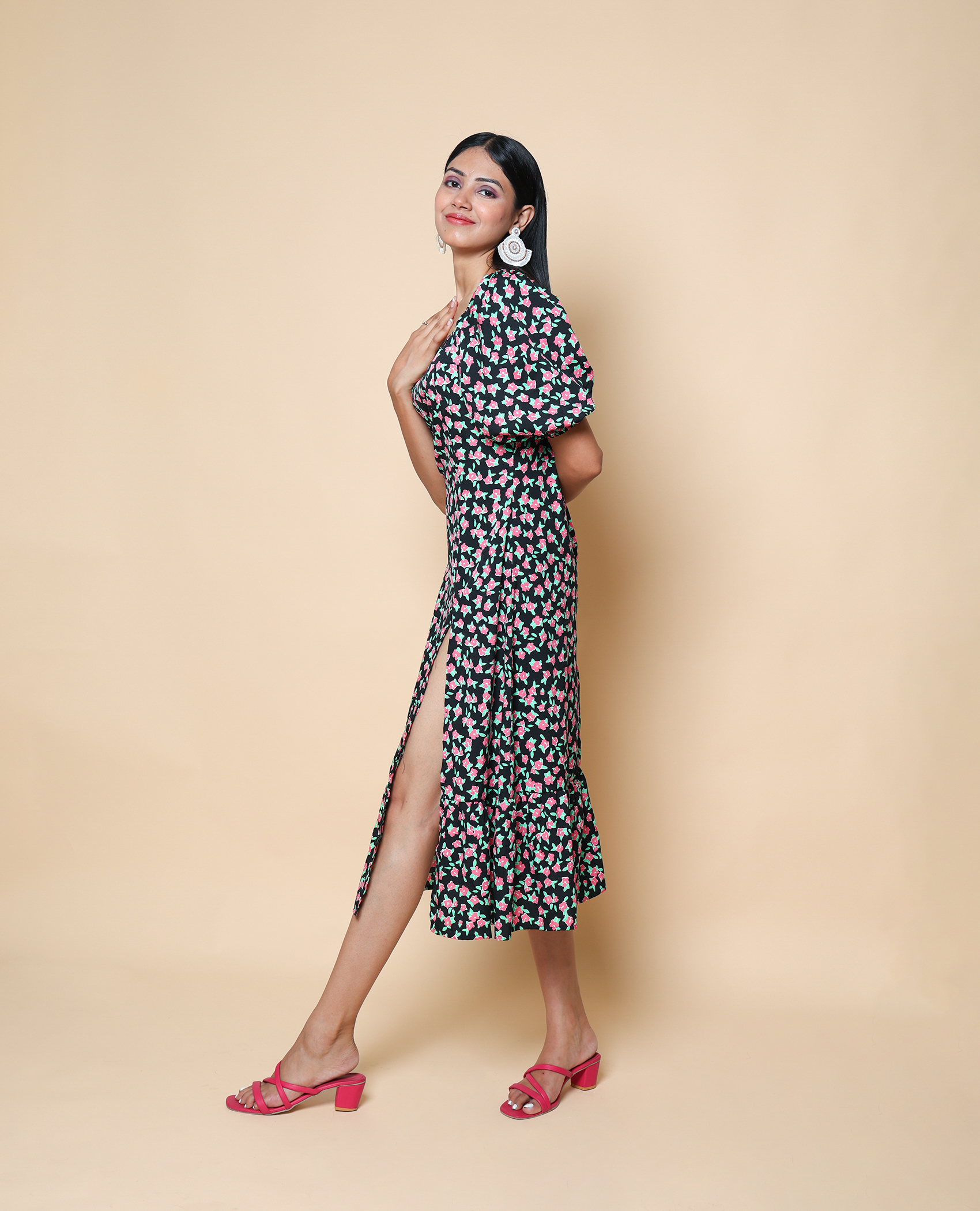 A comfy black floral dress made for casual outings. Soft fabric, relaxed fit, and floral prints that add a hint of freshness to your everyday style.