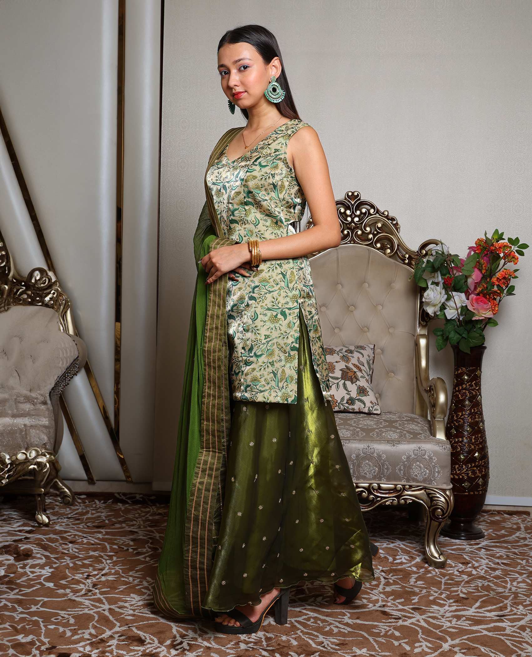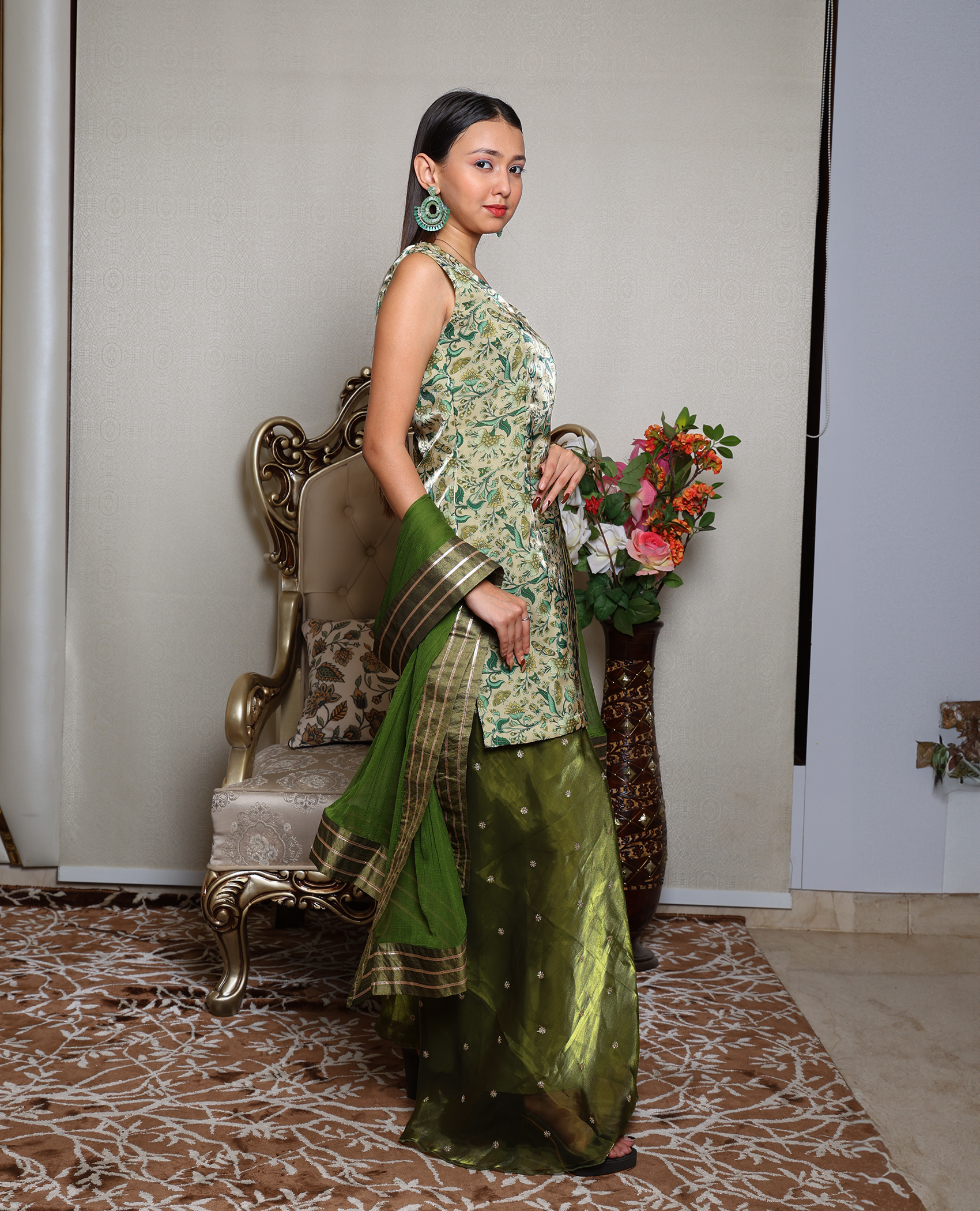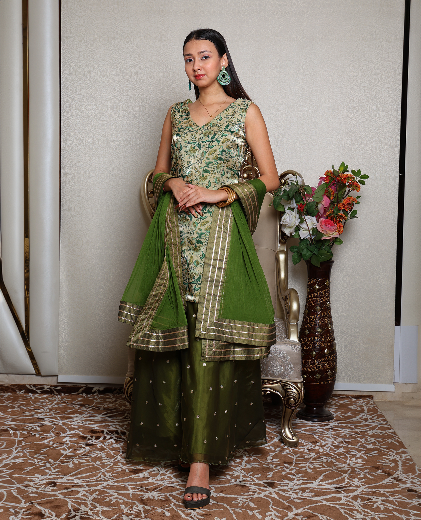 Crafted with attention to detail, this green ethnic set features a harmonious blend of fabric, color, and silhouette, offering a stylish and comfortable look for festive gatherings or casual wear.