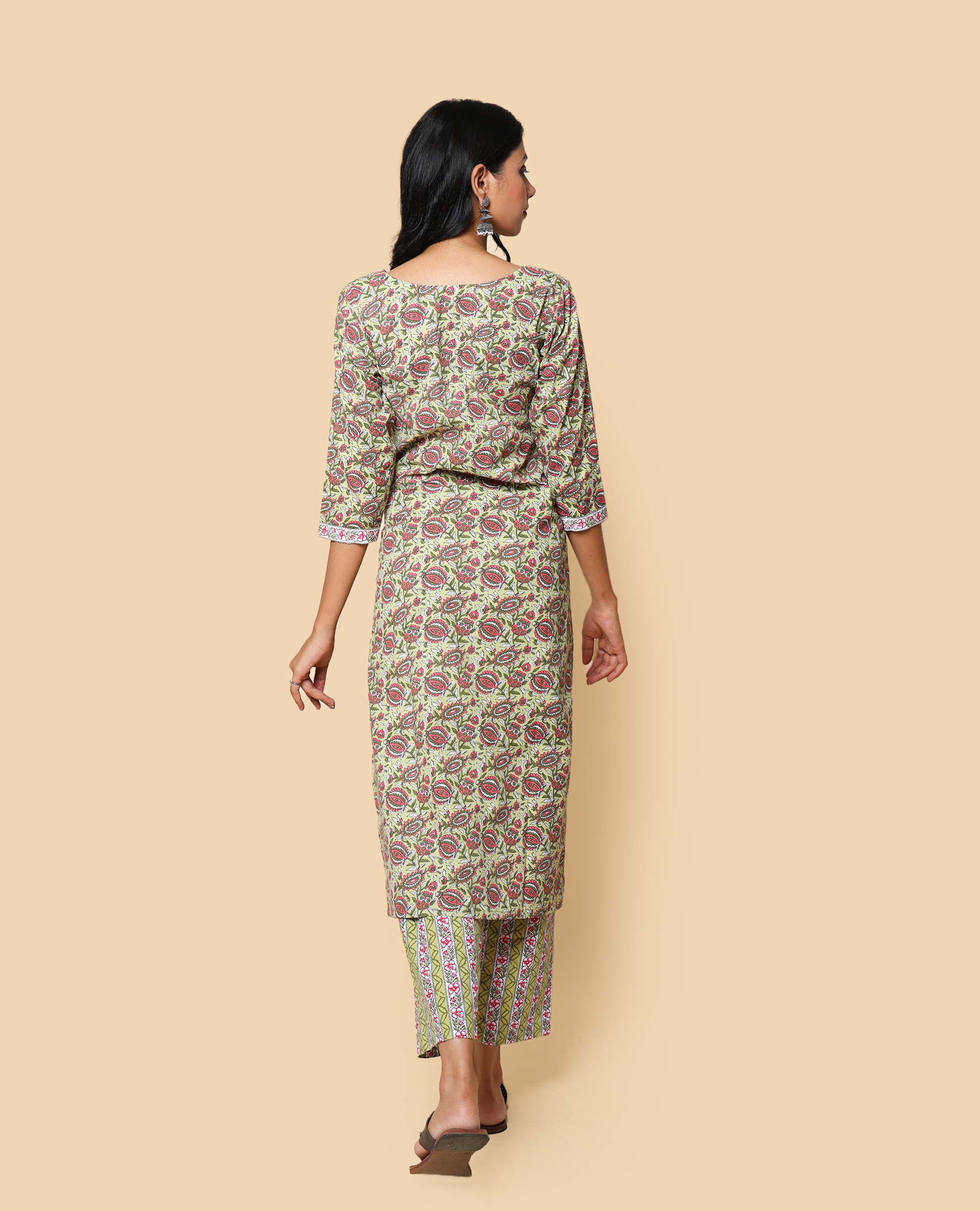Step out in comfort and style! This mehndi-colored floral kurta set is lightweight, soft, and perfect for casual days and easygoing outings.”
