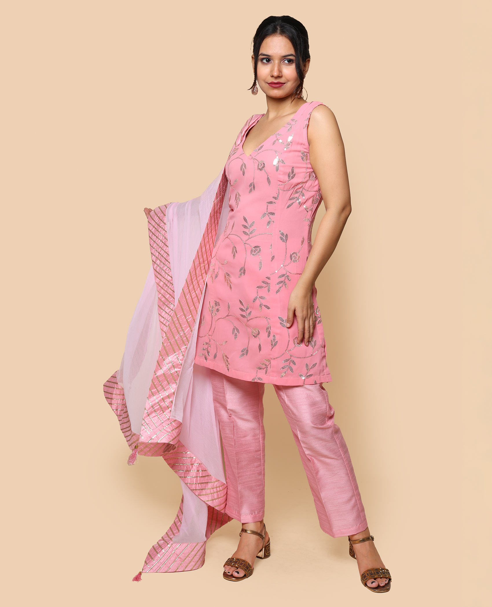 This georgette sequins pant set shines with elegance, featuring sparkling sequins and a chic tailored fit. Perfect for parties, evening events, or festive occasions, it offers a glamorous and stylish look.